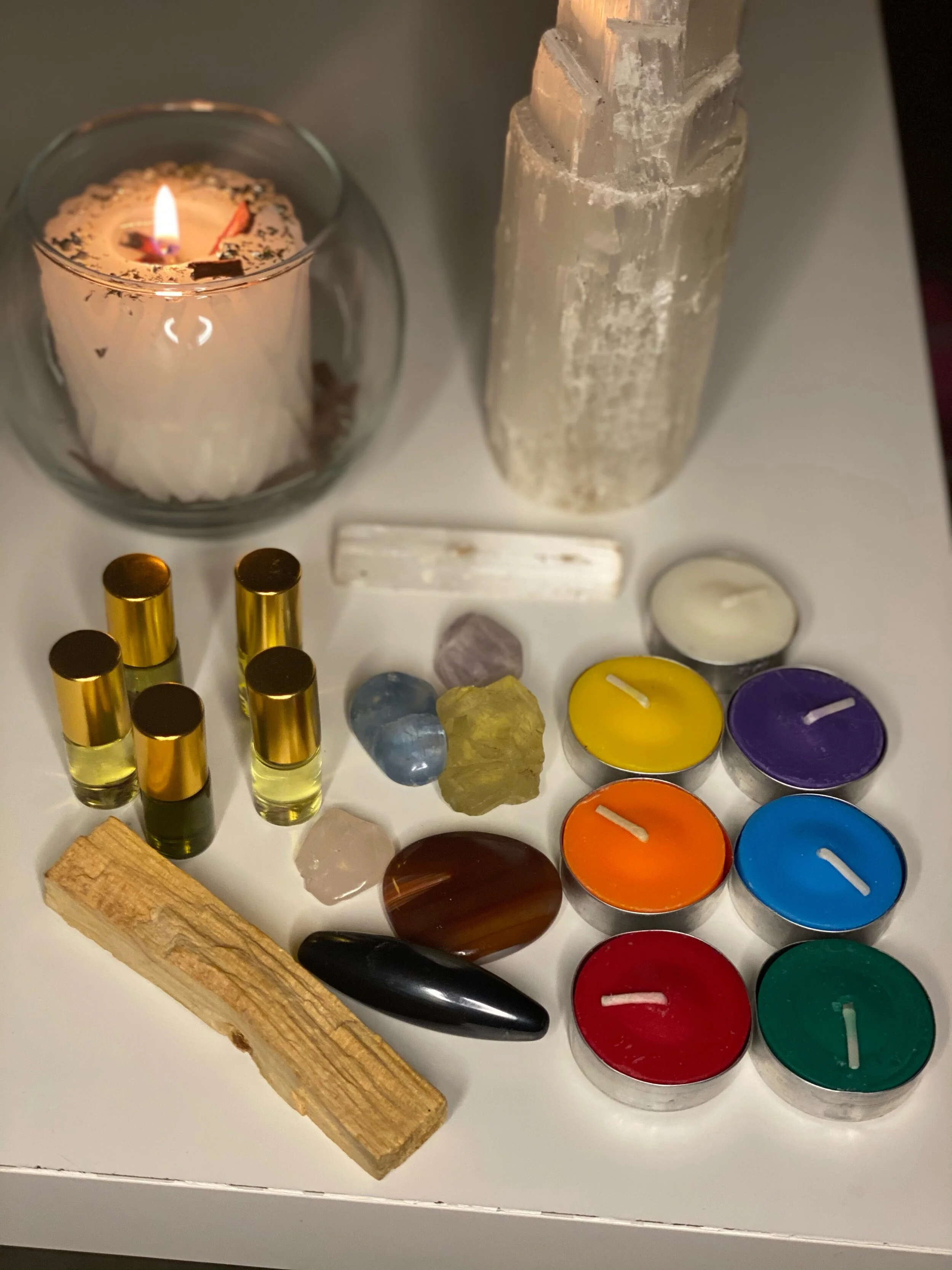What better way to start or aid your spiritual journey than with an essential kit of spiritual items? Our Baby Witch Kit contains a set of chakra tealight candles, a chakra crystal set specific to your sun sign, a palo santo smudge stick, and our MoonKissed Oils sampler pack.